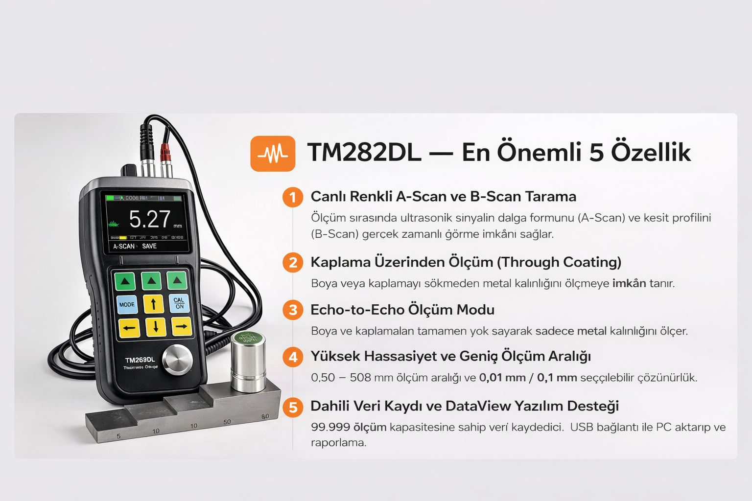 TM282DL Ultrasonik Kalınlık Ölçüm Cihazı, Boya üzerinden ölçüm : 3-50mm, Ölçüm aralığı :0.50mm ila 508mm,