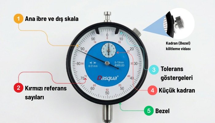5. Sıfırlama ve bezel ayarı: Komparatör ölçüm yapılacak yüzeye temas ettirildikten sonra dıştaki döner çerçeve çevrilerek ibre sıfır noktasına hizalanır. Bu işlem referans noktası oluşturur ve ölçüm sırasında oluşan sapmaların daha kolay görülmesini sağlar. İstenirse kadran kilitleme vidası sıkılarak yapılan ayar sabitlenebilir.