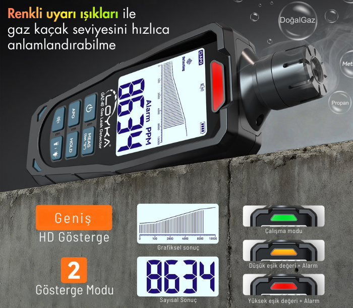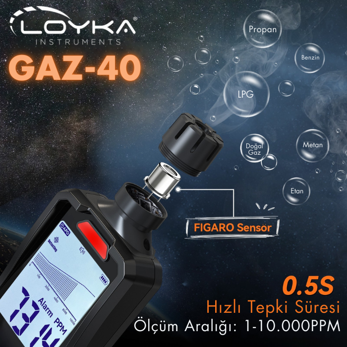 Loyka GAZ-40 Profesyonel Yanıcı Gaz Kaçak Dedektörü; metan (CH₄), propan (C₃H₈), LPG, doğal gaz, hidrojen ve benzeri tüm yanıcı gazların tespitinde kullanılmak üzere geliştirilmiş, yüksek hassasiyetli bir güvenlik cihazıdır. Japon Figaro marka sensörü sayesinde son derece kararlı ve güvenilir ölçüm performansı sunar. Dahili şarj edilebilir bataryası, sesli ve renkli ışıklı alarm sistemi ile hem profesyonel hem de bireysel kullanımda güvenli ve pratik bir çözüm sağlar.