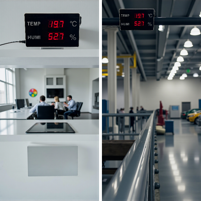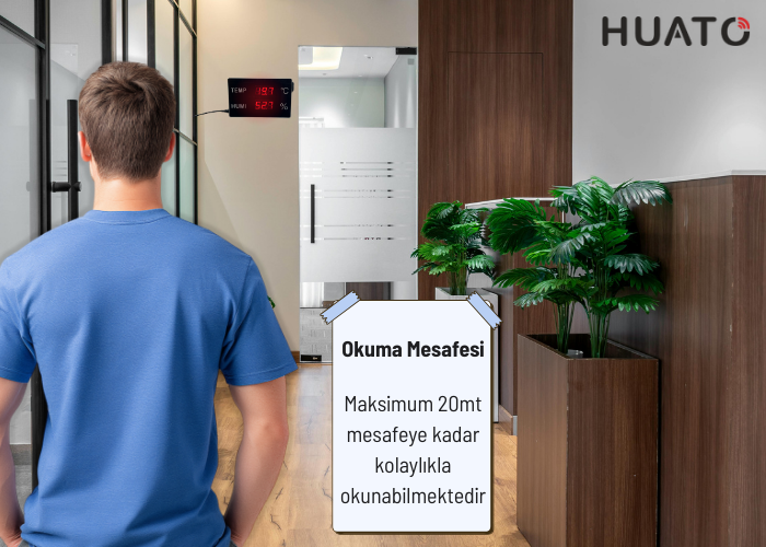 HE218A-TH büyük LED ekranlı endüstriyel sıcaklık ve nem ölçer; atölye, depo, ofis ve benzeri geniş iç mekanlarda sıcaklık-nem takibi için geliştirilmiş, 20 metreye kadar net okunabilirlik sunan profesyonel bir dijital termohigrometredir. İsviçre menşeli entegre sensör teknolojisi sayesinde uzun süreli kullanımlarda dahi kararlı ölçüm performansı sağlar. Cihaz üzerinde bulunan sıcaklık ve nem kalibrasyon fonksiyonu ile ölçüm değerleri kullanıcı tarafından aşağı/yukarı ofsetlenebilir.
