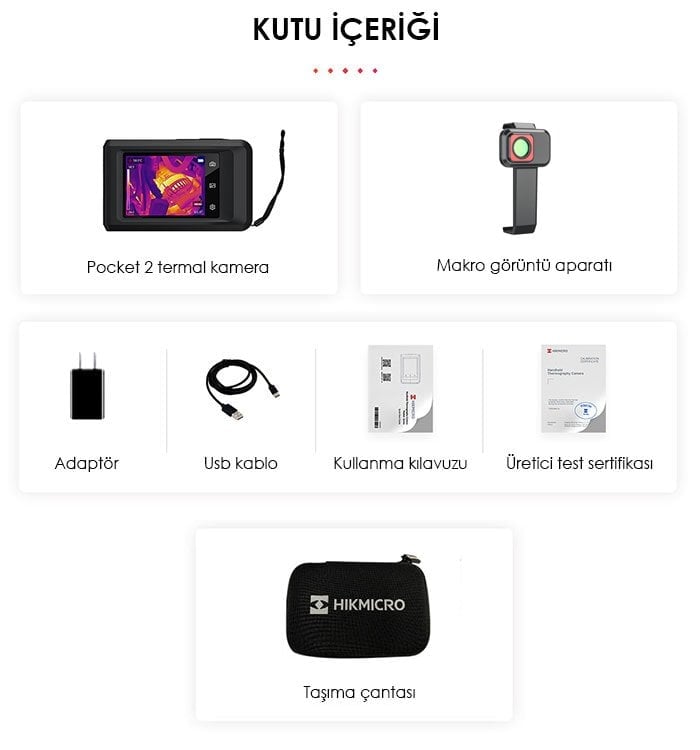 Ürün; HIKMICRO Pocket2 termal kamera ve HM-P201-MACRO makro lens aparatı ile birlikte teslim edilir. Kutu içeriği partiye göre değişiklik gösterebilir.