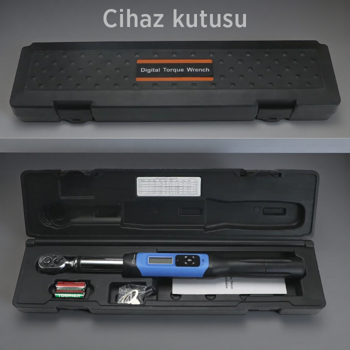 Kutu İçeriği: Loyka AWJ3-85 dijital torkmetre, 2 adet AA pil, İngilizce kullanım kılavuzu ve pil kapağı açma aparatı.
