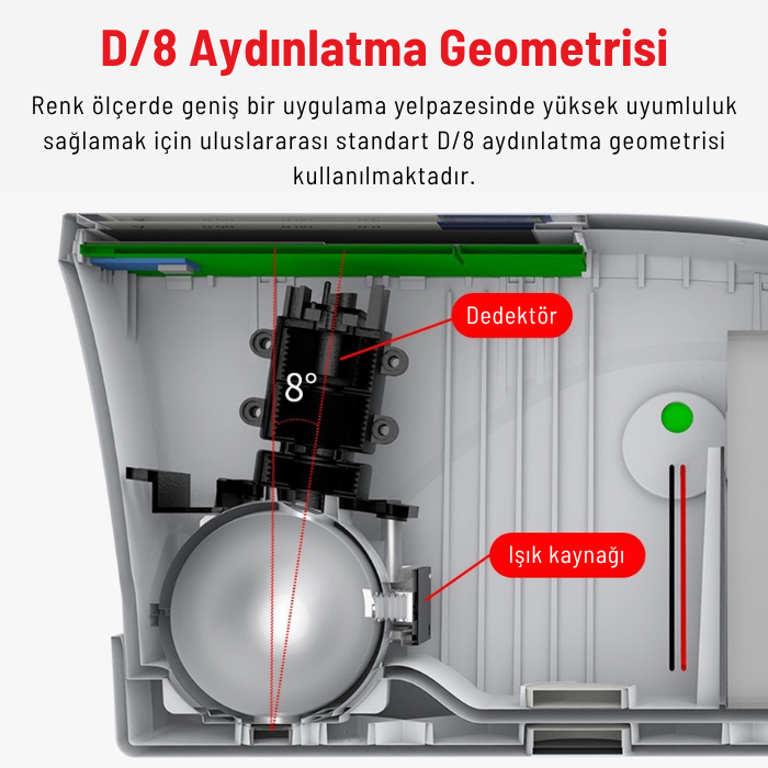 - D65 ışık kaynağı ve 10° gözlem açısı ile uluslararası standartlara uygun ölçüm koşulları.