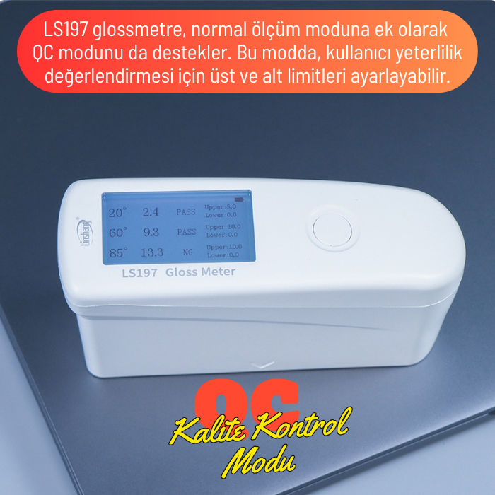 QC (Kalite Kontrol) Modu: Ölçüm sonuçları önceden tanımlanan alt ve üst limitlere göre karşılaştırılır. Bu sayede seri üretim ve kalite denetim süreçlerinde hızlı uygunluk kontrolü yapılabilir. Limit değerleri bilgisayar yazılımı üzerinden ayarlanabilir.