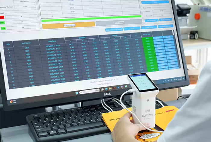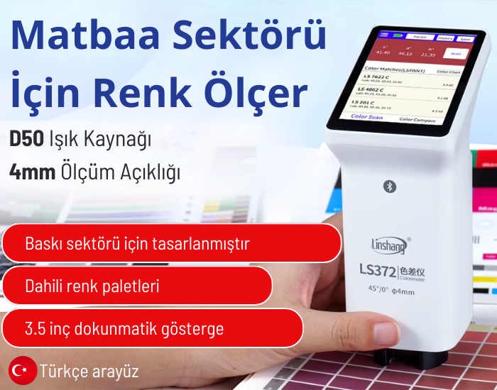 LS372 Matbaa İçin Profesyonel Renk Ölçer; baskı sektörünün talep ettiği yüksek hassasiyet standartlarına uygun olarak tasarlanmış, akıllı dokunmatik ekrana sahip profesyonel bir kolorimetredir. D50 standart ışık kaynağı ile numunelerin referans gözlem koşullarındaki renk değerlerini doğru ve tutarlı biçimde analiz eder. Bu sayede baskı provası, kalite kontrol ve renk tutarlılığı yönetiminde güvenilir sonuçlar elde edilmesine yardımcı olur.