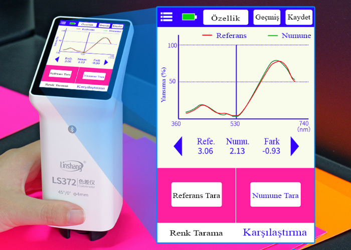 LS372, spektral yansıma eğrileri sunarak renk analizini daha ileri seviyeye taşır. Bu özellik; metamerizm araştırmaları, özel efektli mürekkep değerlendirmeleri ve detaylı renk karşılaştırmalarında fayda sağlar. Metamerizm, iki rengin bir ışık altında benzer görünürken farklı bir ışık kaynağı altında farklı görünmesi durumudur.