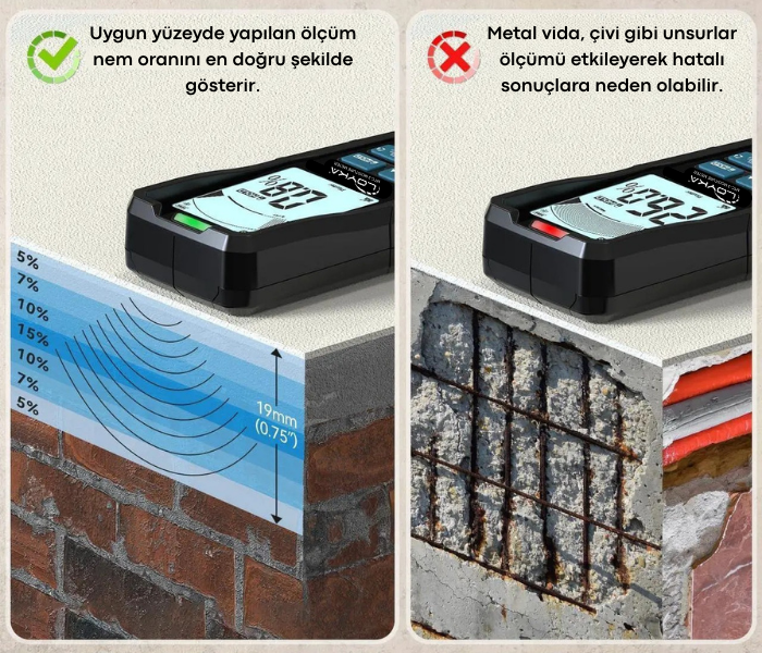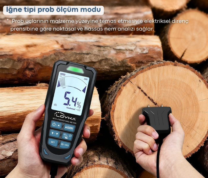 - İğne problu modda yumuşak/sert ahşapta daha doğrudan ve hassas ölçüm.