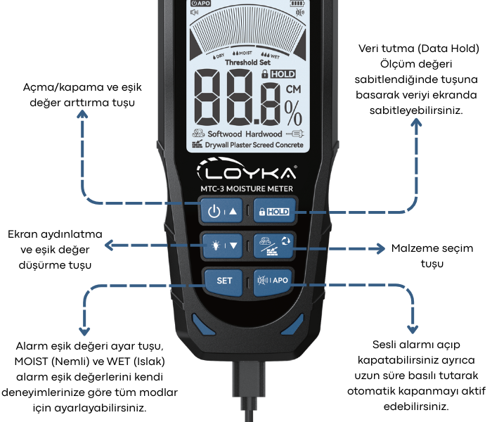 MTC-3; manyetik (indüktif) ölçüm ve harici iğne tipi prob desteğiyle ahşap ve yapı malzemelerinde hızlı, tutarlı ve pratik nem ölçümü yapmak için tasarlanmış 2-in-1 profesyonel nem ölçerdir. 6 farklı malzeme modu, üç renkli uyarı göstergesi, çubuk grafik ekran ve ayarlanabilir MOIST/WET alarm eşikleri sayesinde sahada nem seviyesini anlık olarak takip etmeyi kolaylaştırır. Type-C üzerinden şarj edilebilen 1200 mAh lityum batarya, HOLD ve 5 dakikada otomatik kapanma (APO) gibi fonksiyonlarla günlük kullanımda verimlilik sağlar.