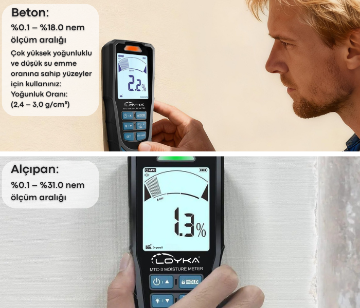 Ölçüm Aralığı (Malzemeye Göre): Yumuşak ahşap %5.0–%55.0 | Sert ahşap %3.0–%34.0 | Beton %0.1–%18.0 | Alçıpan %0.1–%31.0 | Şap %0.1–%6.0 | Sıva %0.1–%26.0