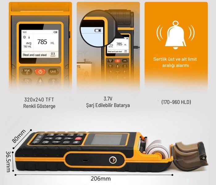 - HL, HB, HV, HS, HRA, HRB ve HRC birimleri arasında ölçüm yapabilen leeb sertlik ölçer.