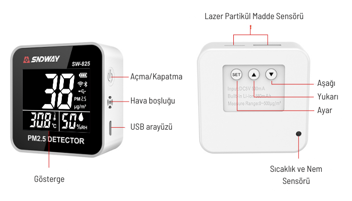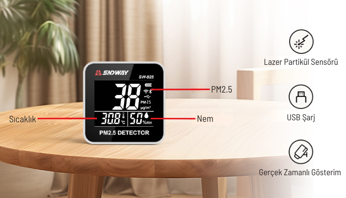 SNDWAY SW-825 PM2.5 Hava Partikül Ölçer; iç ve dış ortamlardaki PM2.5 partikül yoğunluğunu gerçek zamanlı olarak izleyebilen, sıcaklık ve nem ölçümü de yapabilen şarjlı ve taşınabilir bir hava kalitesi monitörüdür. Yüksek kontrastlı LED ekranı sayesinde ortam havasının kalitesi anlık olarak takip edilebilir. Kompakt yapısı, şık tasarımı ve kablosuz kullanım avantajı ile ev, ofis, araç içi ve açık alanlarda pratik bir çözüm sunar.