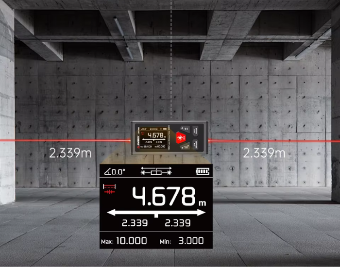 Çift yönlü ölçüm özelliği sayesinde bir alanın tam orta noktası otomatik olarak hesaplanabilir. Ölçülen toplam mesafe cihaz tarafından iki eşit parçaya bölünerek merkez noktası net şekilde belirlenir. Bu özellik; simetri merkezi, montaj noktası veya eksen belirleme işlemlerinde büyük kolaylık sağlar.