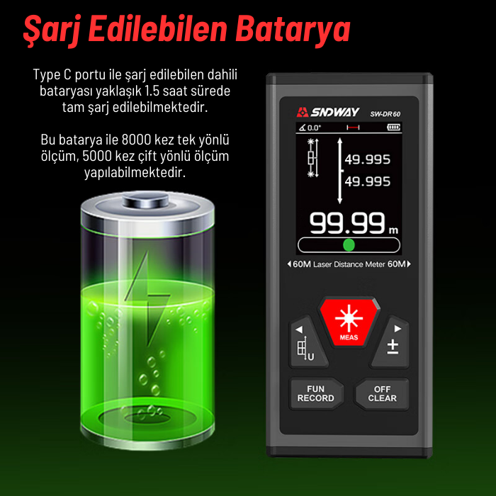 SW-DR60; yatay ve dikey ölçüm desteği, uzunluk ölçümü, toplama–çıkarma işlemleri, alan ve hacim hesaplama, Pisagor ölçümü ile açı ve yükseklik ölçümü gibi çok sayıda fonksiyonu tek cihazda birleştirir. Geniş fonksiyon menüsüne cihaz üzerindeki “FUN / RECORD” tuşu ile erişilebilir.