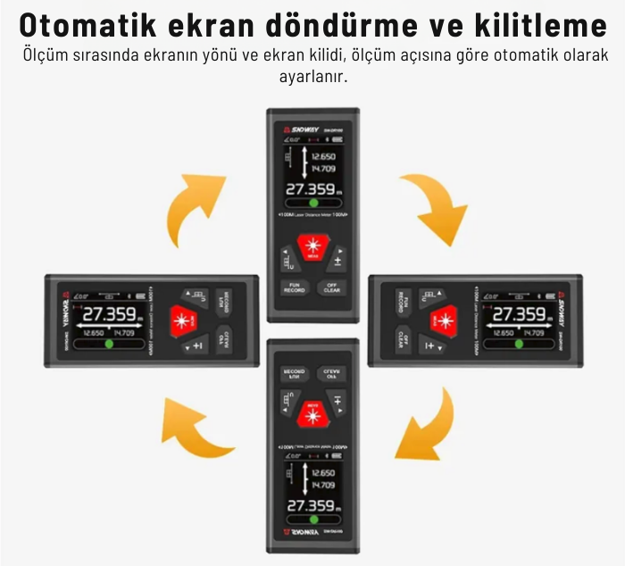 Elektronik su terazisi ve anlık açı göstergesi sayesinde cihazın konumu ekrandan takip edilebilir. Otomatik ekran döndürme özelliği ile cihaz tutulduğu yöne göre ekran görüntüsü otomatik olarak uyum sağlar ve her pozisyonda rahat okuma imkânı sunar.