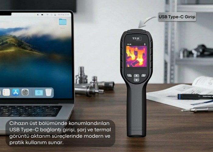 Entegre lazer işaretleyici, sıcaklık alarmı, 4 GB dahili hafıza, USB Type-C bağlantısı, yaklaşık 8 saat çalışma süresi ve IP54 koruma sınıfı gibi özellikleri ile saha kullanımına uygun hale getirilmiştir. TFA VisualTemp termal kamera; bakım, arıza tespiti, tesis kontrolü ve genel sıcaklık taramaları için pratik ve güvenilir bir yardımcıdır.