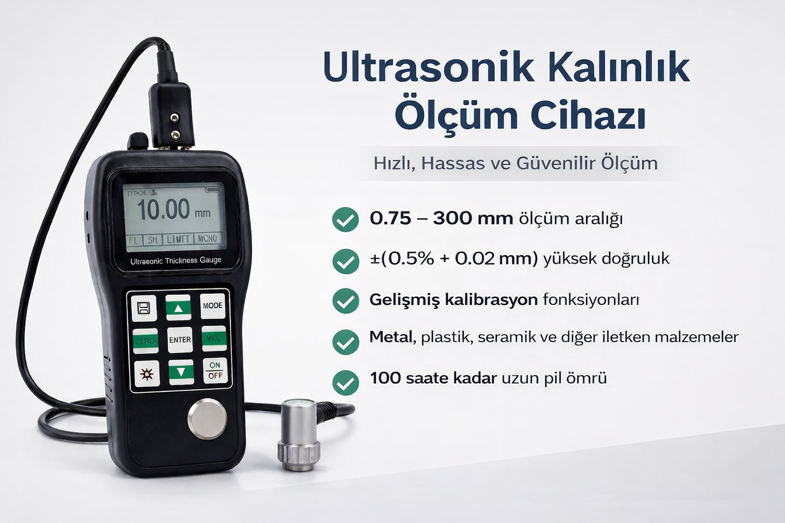 Ultrasonik kalınlık ölçüm cihazı; metal, plastik, seramik, kompozit, epoksi, cam ve ultrasonik dalgaları iyi ileten diğer malzemelerde hızlı ve hassas kalınlık ölçümü yapmak için tasarlanmıştır. Endüstriyel kalite kontrol, bakım ve saha ölçümlerinde güvenilir sonuçlar sunar.