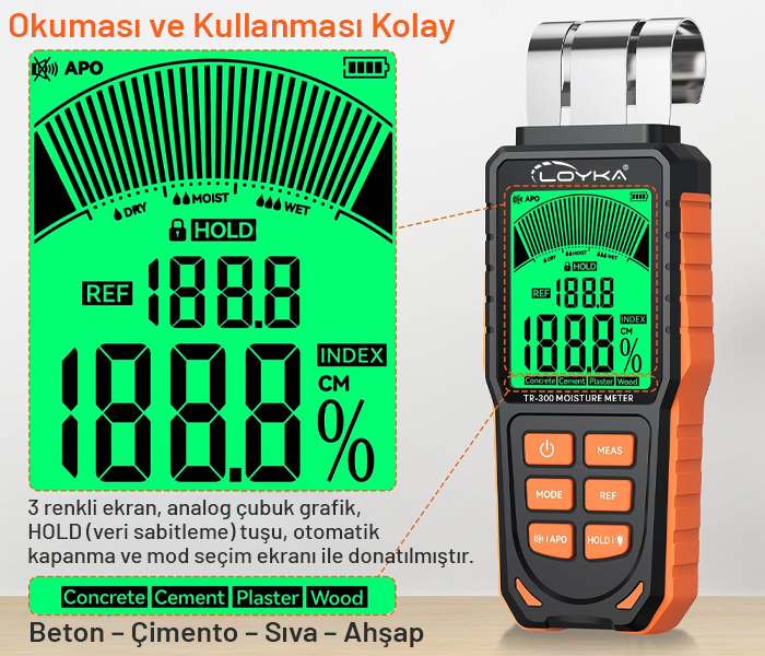 | Ölçüm Aralığı | INDEX: 0 – 100 Beton: %0 – %19 Çimento: %0 – %28 Alçı/Sıva: %0 – %39 Ahşap: %0 – %52 |