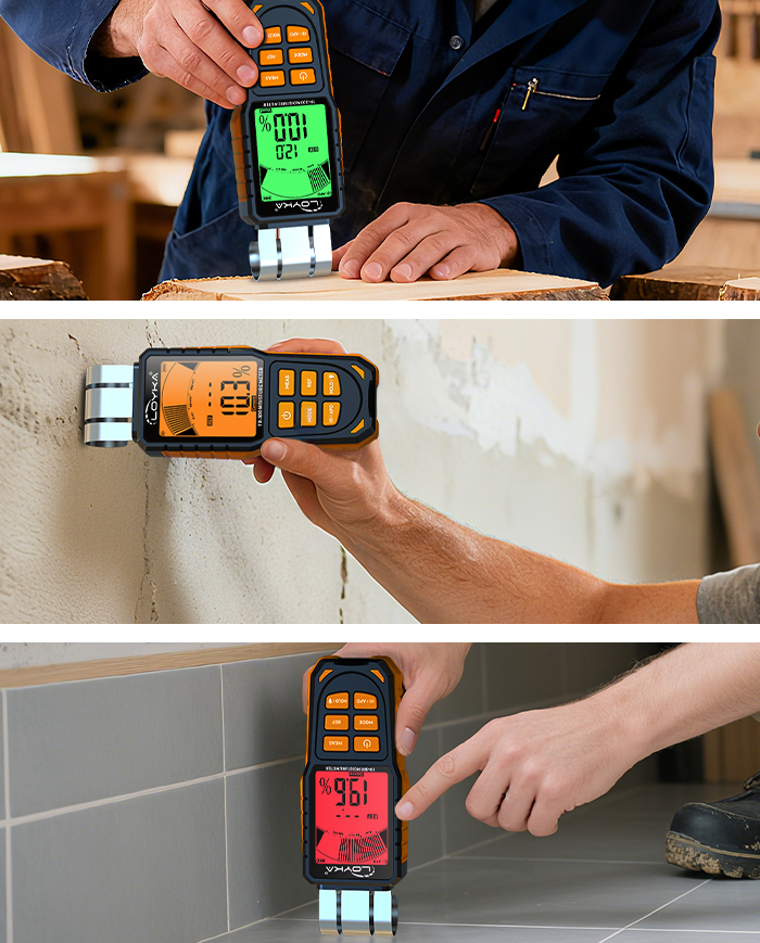 - 3 renkli LCD uyarı sistemi: Kuru/Riskli/Islak seviyeleri ekran rengi ve bar-graph ile hızlı anlaşılır.