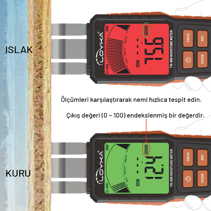- INDEX modu: Halı, deri, kumaş, kâğıt ve karışık yüzeylerde 0–100 aralığında bağıl nem değeri ile karşılaştırmalı tarama imkânı sunar.
