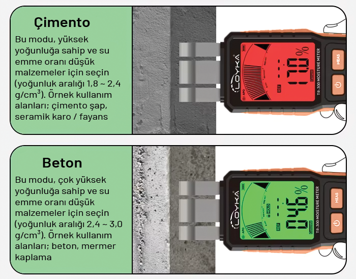 - 4 özel malzeme modu: Beton, çimento, alçı/sıva ve ahşap için ayrı ayrı tanımlı ölçüm modları ile daha doğru değerlendirme sağlar.